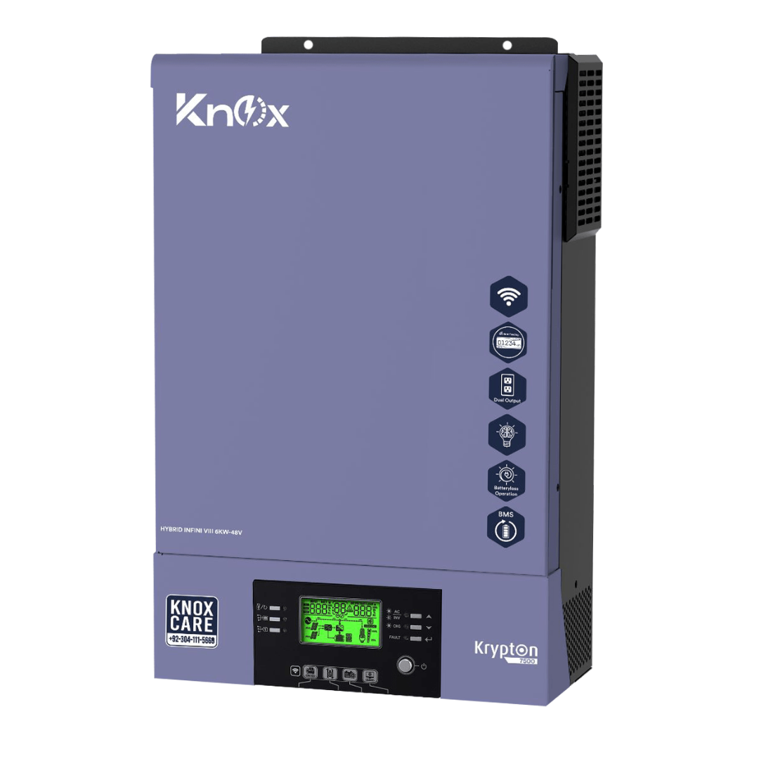 The Knox Krypton 7500 is a 6KW hybrid solar inverter, offering a combination of reliable performance and essential features for efficient energy management. It includes built-in Wi-Fi for online monitoring and is designed to integrate seamlessly with both smart and heavy load applications.