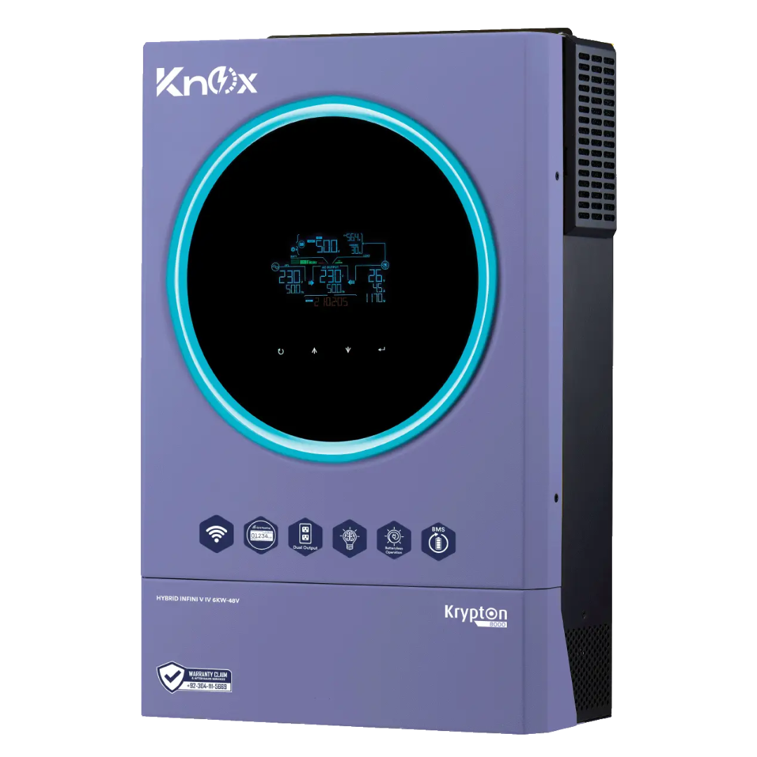 The Knox Krypton 8000 is a 6KW hybrid solar inverter designed for reliable solar energy management. It offers essential features such as built-in Wi-Fi for remote monitoring, durability with an IP21 rating, and efficient integration with both smart and heavy loads.