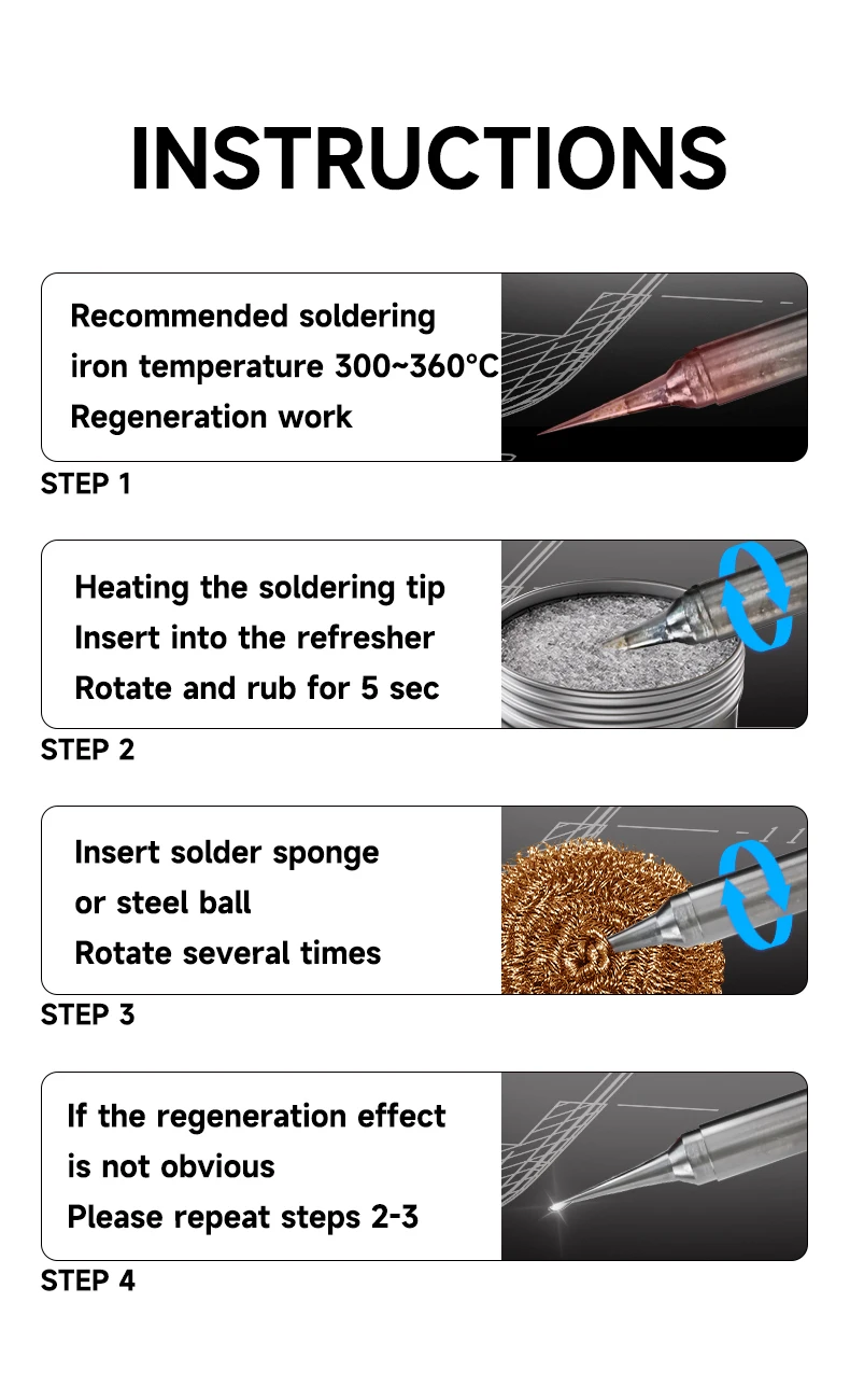 The Mechanic QR12 Soldering Tip Refresher is a quick and effective solution for cleaning and restoring soldering iron tips. It removes oxidation, burnt residue, and old tin from the tip, helping restore smooth solder flow. The non-stick cream paste formula cleans without damaging the tip surface.